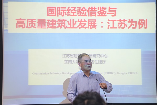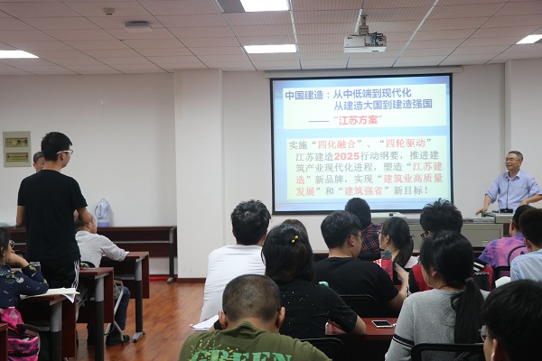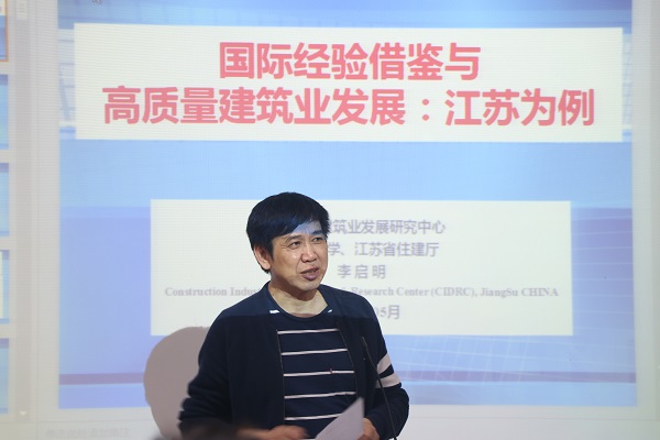 李启明教授首先向在座师生介绍了东南大学工程管理专业的研究平台和研究领域,并简要说明了报告的主要内容,即国际经验借鉴和建筑业发展再思考。李启明教授通过列举江苏省以1.1%的人口和5.8%的面积却占据了10.2%的GDP份额的数据为切入点,一方面表明江苏是制造大省和建造大省,另一方面把重点聚焦在建筑和房地产两大产业。他从设计与施工两个方面讲解国际建筑市场的结构与特征,以及国际大型承包商发展的模式和战略,并且借鉴发达国家建筑业发展战略和国内大型央企发展模式。李启明教授基于江苏建筑业近年各项数据指出,江苏省建筑业的现状存在发展不平衡不充分的问题,进而提出江苏建筑业未来20年如何发展的思考,并分享了从传统产业向现代产业转变,以及从劳动密集型向技术密集型、知识密集型转变的想法,更通过再思考提出了中国建造从低端到现代化和从建造大国到建造强国的江苏方案。