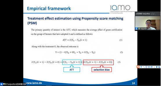 接着,Yanjun Ren研究员以四川省的水稻种植为例,运用倾向得分匹配法(PSM)以及工具变量法(IV)测算了接受农产品认证与不接受农产品认证的两类稻农在福利上的差异。随后,Yanjun Ren研究员又分析了不同教育程度,不同种植规模的稻农在福利上的差异及显著性。