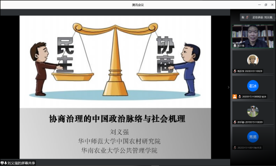 刘教授从协商民主话语的中西“时代错置”、协商治理的传统中国政治脉络和社会机理以及协商治理的现实政治安排三个方面展开报告。首先,刘教授介绍了“时空错置”的概念,从西方语境下民主的困境、人民平等说话权利和审慎思考做决定的权利之间的冲突,引出了协商民主的中国语境,并从理论引入、实践形态和高层政治提升三方面具体阐述。