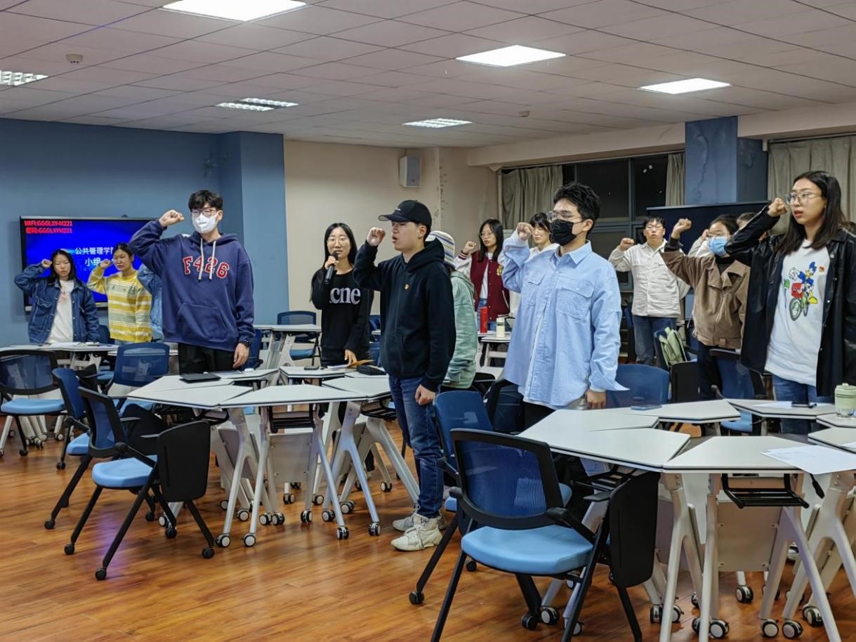 本次比赛邀请了辅导员樊林玉作为特邀嘉宾,由全体观众评委进行打分。比赛开始前,樊林玉带领全体人员重温了庄严的入党宣誓,右手握拳,神情肃穆,声音洪亮,铿锵有力的誓词在教室中回响。