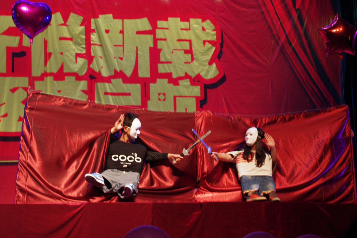 院的情景剧《Mini Funny》。刚出场时,你一定很好奇,小人的手和脚从哪儿来?其实每个小人都需要两个同学的合作,一个同学两只手套上衣服,做小人的脚,而另外一名同学站在表演的同学身后,只露出两只手,看似简单的动作,却需要两个人的默契配合。小说《射雕英雄传》,小虎队的《爱》,以及之前大热的wonders girls 的《nobody》都在幕布前以幽默欢快的效果得到了再次展现。而舞道节拍的舞蹈《love in the club》也展现了当代大学生的活力与热情。