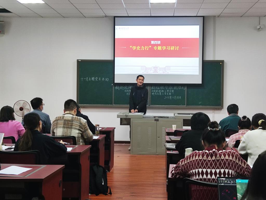 随后,全体党员开展“学史力行”专题研讨。姜庆志同志提出要把理论运用到改造主观和客观世界,把经验融入到“修身、齐家、治国、平天下”的历史文化中。做到“真学真行”,要及时学、准确学、深入学、有效学;要锤炼政治品德,严格修身立己,为师生服务力行,为国家战略大政方针所行。