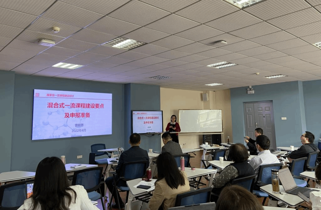 曹敏惠副院长从主讲教师的角度以《混合式一流课程建设要点及申报准备》为题,结合申报国家级一流课程的心得体会,从一流课程标准、存在问题、设计与实践、申报要点等四个方面详细介绍了混合式一流课程网络评审要点,还通过长江雨课堂互动教学的形式让老师们感受到课程建以致用和以数说理的重要性。她认为,一流课程建设的根本目的在于唤醒学生的内驱力,促进学生的学习与发展。一流课程建设中存在的最大问题是缺乏思政性(思想性)和挑战度(学术性)。要以行导人、以理服人、以情感人、以文化人,春风化雨和润物无声的开展课程思政;要改革教学理念、教学方式、考核方式,通过变知识传授为能力提升、变传统灌输为奇思妙想、变应用性知识学习为创造性知识学习开展课程改革;通过教学学术和科研学术共促教师发展;通过信息技术、行为数据化、智慧教室开展智慧教学。
