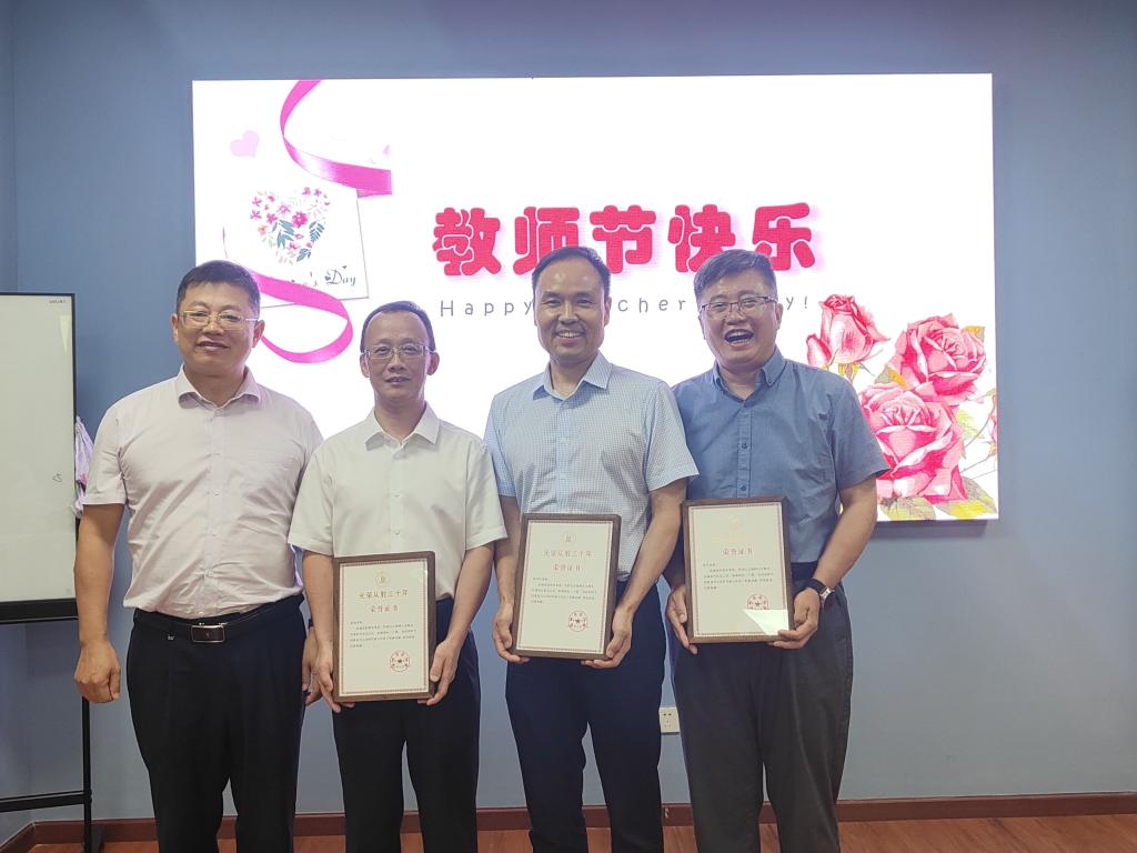 发展及学生成长的奉献表示衷心地感谢,向从教满30年的蒋勇、杨兴权、张军三位老师颁发了荣誉证书。蒋勇老师深情回顾了自己30年的教学生涯,感慨道:“这三十年来,我在同事们的支持与帮助下,虽取得了一些成绩,但更重要的是,我始终保持着对教育的热爱与探索,不断尝试创新,开设新课,力求为学生带来更加丰富多元的学习体验。”张军老师分享了自己作为班主任的宝贵经验,他讲述了一个将普通班级转变为优秀集体的感人故事,强调了师生间相互理解、共同努力的重要性。张老师的话语中充满了对学生们的感激之情,他认为正是与学生们共同成长的过程,让他的教育生涯更加充实而有意义。杨兴权老师也分享了他与学生相互成就的过程,在实践中助力学生成长成才。在心声互动环节,在座教师纷纷向三位老师提问,就教学方法、班级管理、师生关系等话题展开了热烈而深入的交流。这一环节不仅增进了教师之间的沟通与理解,也为年轻教师提供了宝贵的学习机会。