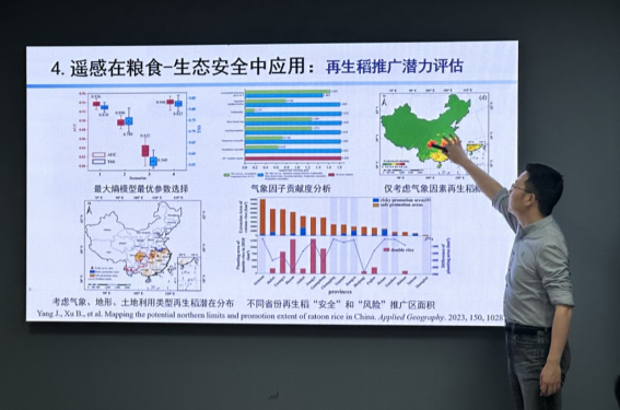 徐保东副教授主要从遥感知识的相关介绍、耕地及作物类型识别、作物长势关键参数反演以及遥感在粮食生态安全中的应用四个方面开展交流,并且分享实际案例以便于大家更深刻体会其意义。该类交叉研究的意义在于可以借助遥感技术实现粮食安全监测。