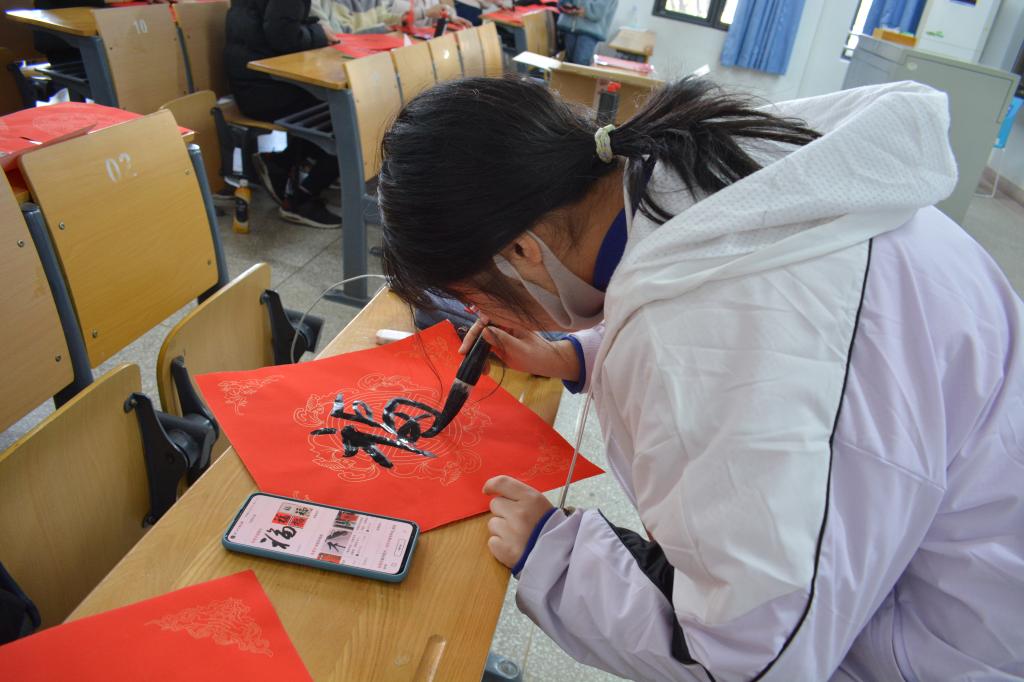 首先,青志工作人员翟津津为志愿者们讲述了福字书写流程,然后将志愿者们分为小组,以小组为单位分发毛笔、纸张、墨碟等工具。同学们观看完毛笔字教程视频后开始尝试在纸上写下福字。书法功底稍差的同学则借助铅笔先在纸上描绘出福字的轮廓,再蘸墨填充。经过一个小时认真投入的创作,每位志愿者的笔下都诞生了一张张红纸“福”字。其中土规1901班夏玥写出的花体福字美观流畅而不失端正,得到了大家的一致好评。随后,负责人统一收集福字,将充满心意的福字祝福寄至武昌医院。