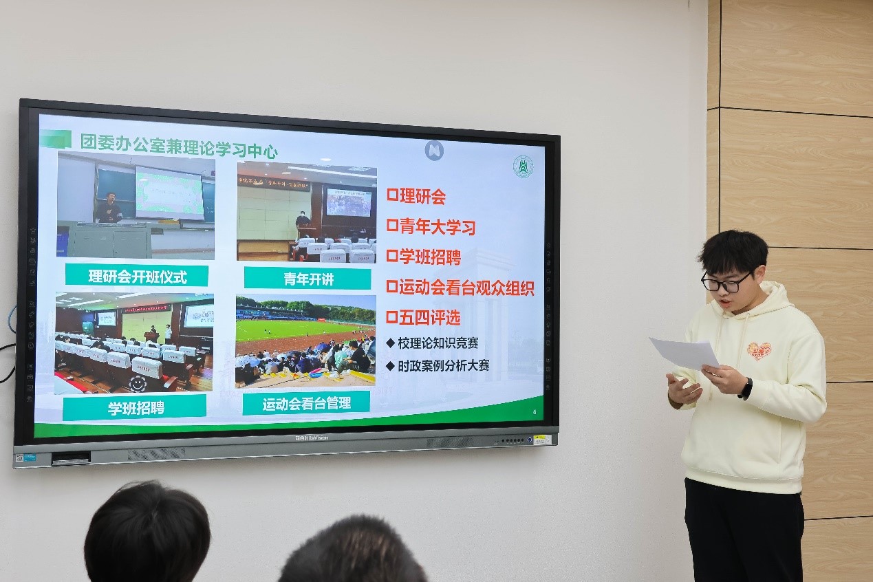 学生骨干分别介绍了本科生党团学宣学生系统及研究生会的日常工作及工作成果。团委学生兼职副书记蔡嘉译以“团心聚力共奋斗,委身肩负共担当”为题,详细介绍了团委各部门日常工作及特色活动,聚焦理论学习与学生服务。