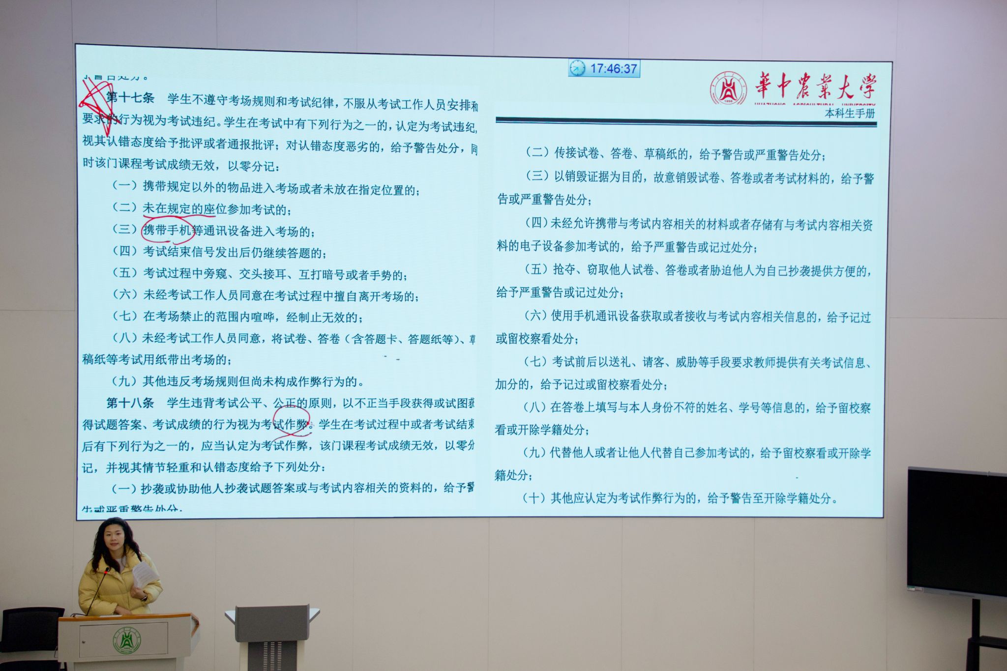 诚信应考,端正学风。针对即将到来的期末考试季,大会进行了严肃的考风考纪教育。会议强调学术诚信是大学生立学立身的根本,辅导员倪含荞详细解读了考试纪律规定及违纪处理后果,并分享警示案例,要求全体同学认真复习、诚信应考,共同维护公平公正的考试环境,培育扎实严谨的优良学风。