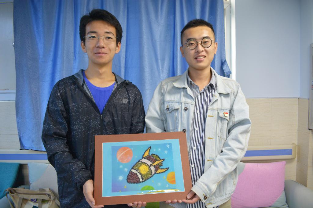 随后进入豆贴画制作环节。要做好一幅豆贴画并不容易,需要耗费一定的时间和精力。志愿者们决定以两两组队的形式帮助患者们完成特色豆贴画。志愿者手把手教大家贴豆子上颜料,鼓励大家调动想象力、大胆创作。在志愿者的耐心指导下,大家都顺利地完成各自的画作。志愿者还同患者们分享、交流自己对于国家兴盛的感触以及对国家美好未来的憧憬。活动最后,大家合影留念。