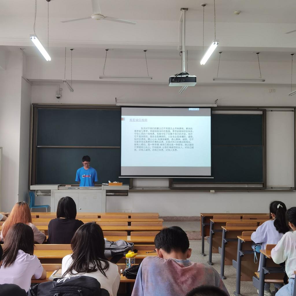 本次班会分为“诚信”和“感恩”两部分。鲜智鹏首先以一则幽默而深刻的短片切入正题,视频中出现的因作弊而忏悔的学生和随时间流逝而老去的父母,引发了同学们对于“诚信”和“感恩”的深刻思考。鲜智鹏表示:不信不立,不诚不行。我们强调“诚信”与“感恩”不仅仅是为了遵守法规、合乎伦理,更是为了培养大学生高尚正直的理想信念和价值取向,时刻以诚信感恩之心待人处事,铭记信以立志,信以守身,信以处世,信以待人。