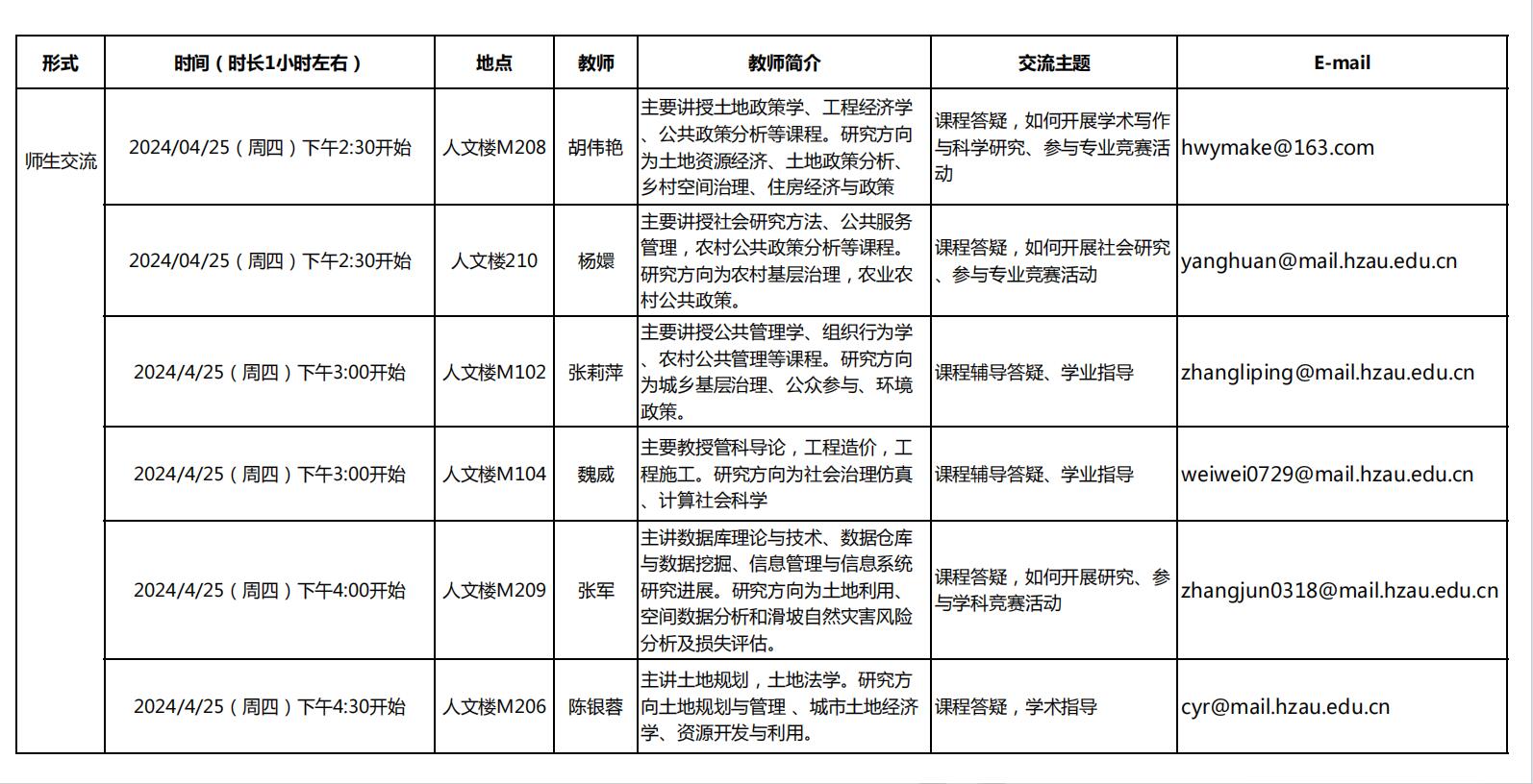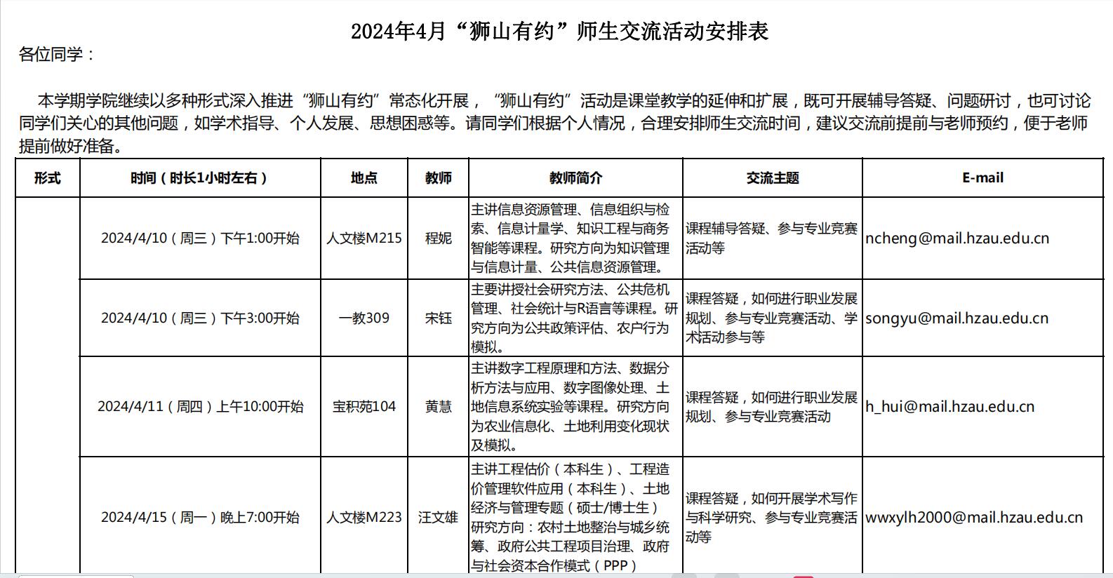 各位同学: 本学期蜜桃传媒 继续以多种形式深入推进“狮山有约”常态化开展,“狮山有约”活动是课堂教学的延伸和扩展,既可开展辅导答疑、问题研讨,也可讨论同学们关心的其他问题,如学术指导、个人发展、思想困惑等。请同学们根据个人情况,合理安排师生交流时间,建议交流前提前与老师预约,便于老师提前做好准备。